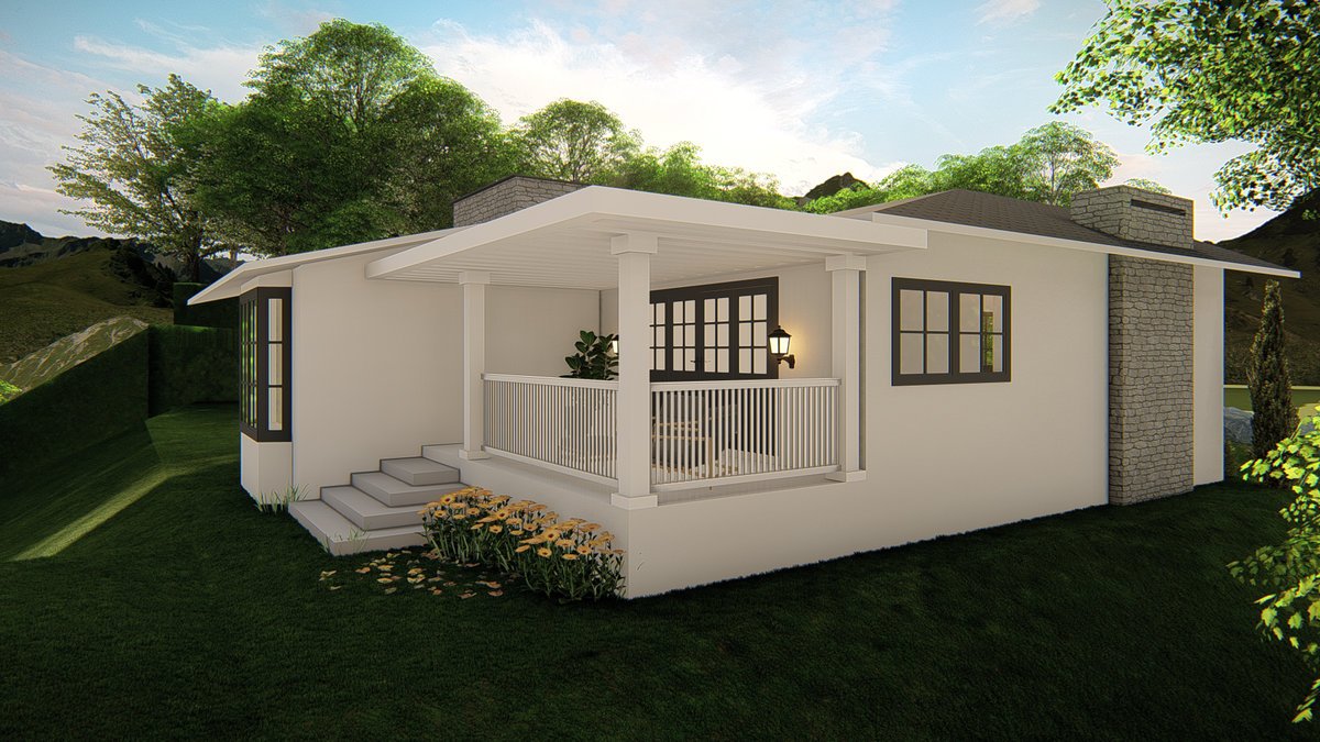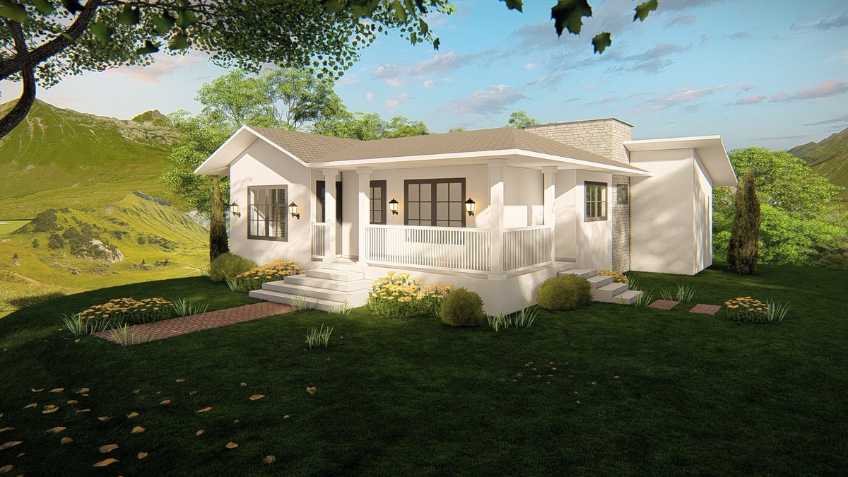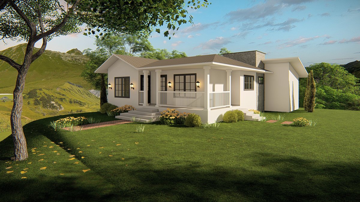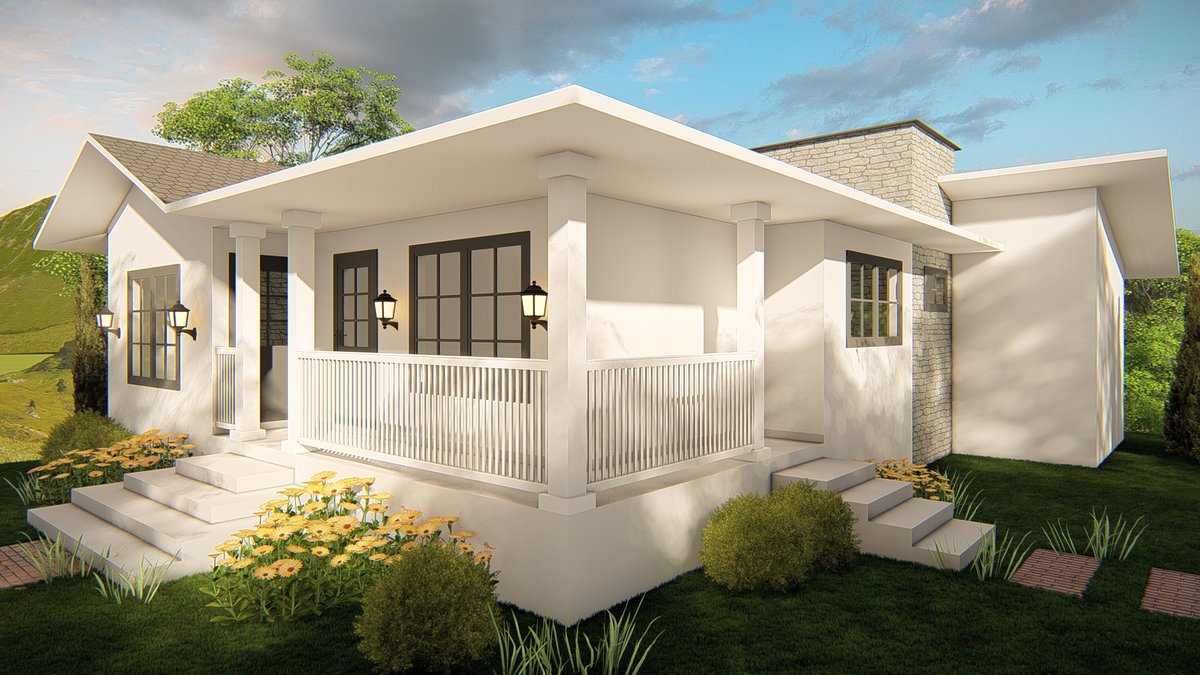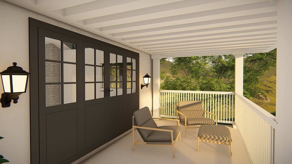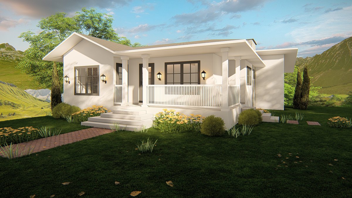Inspirada no estilo americano, ela combina o charme das varandas frontais com colunas elegantes, janelas com caixilhos escuros e um telhado de duas águas que reforça sua estética acolhedora e atemporal.