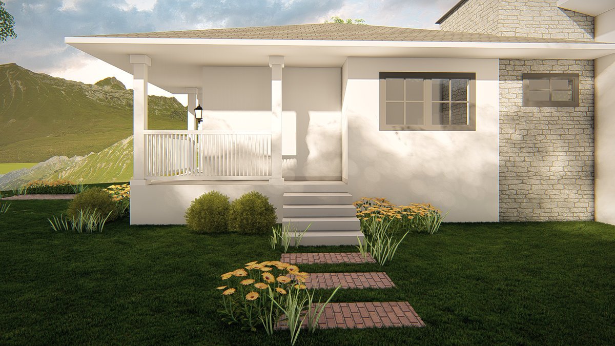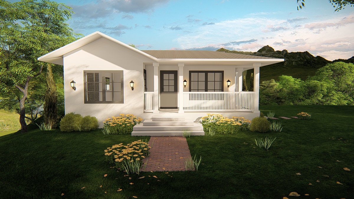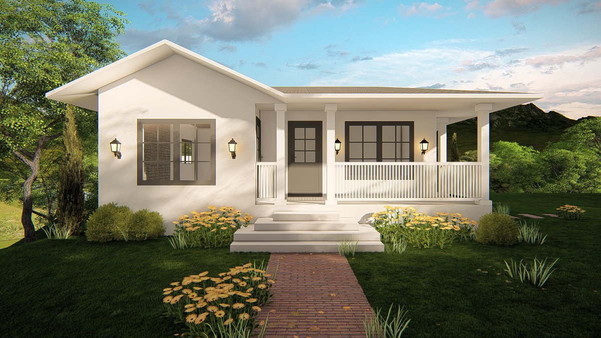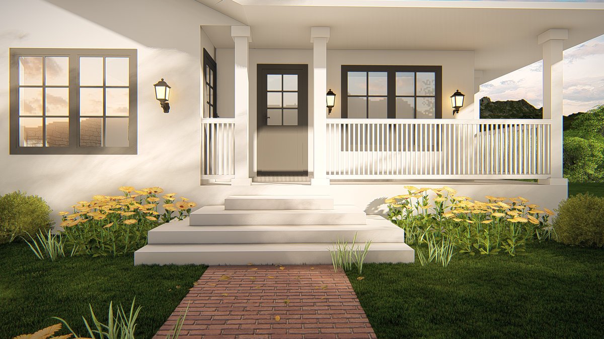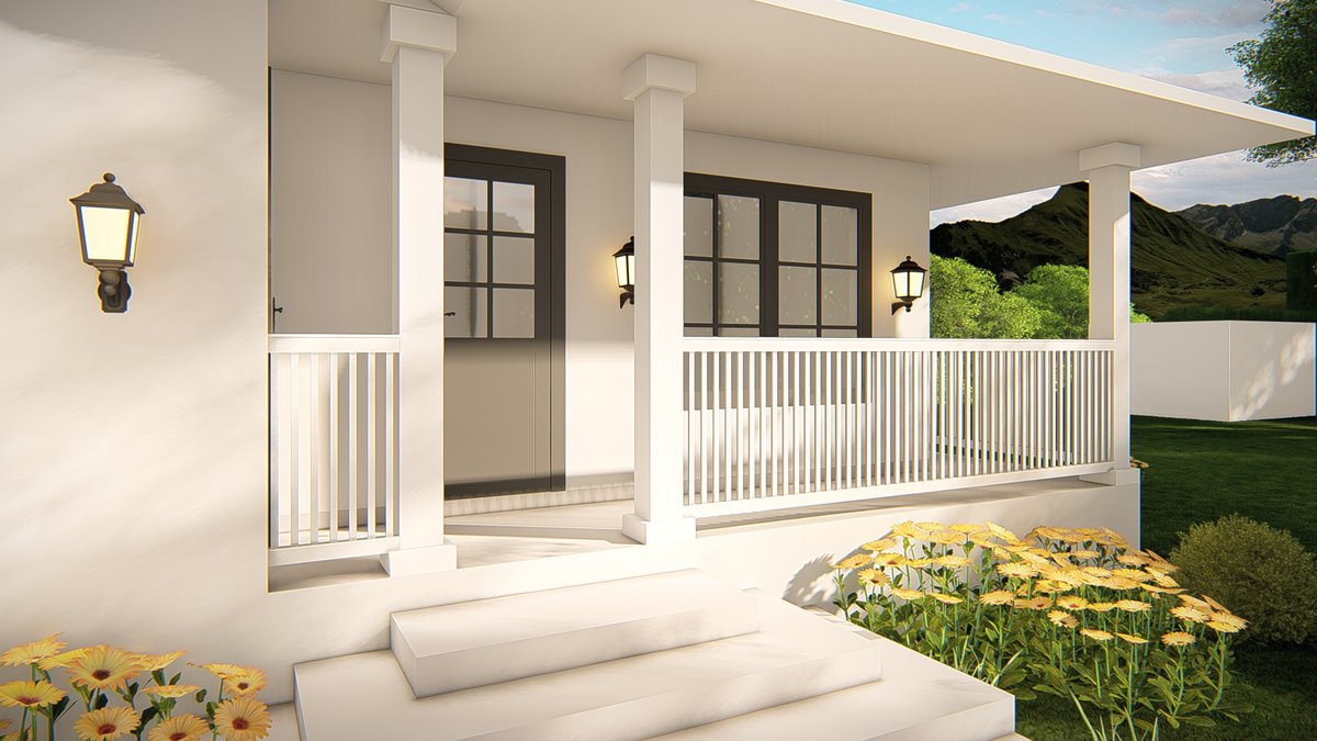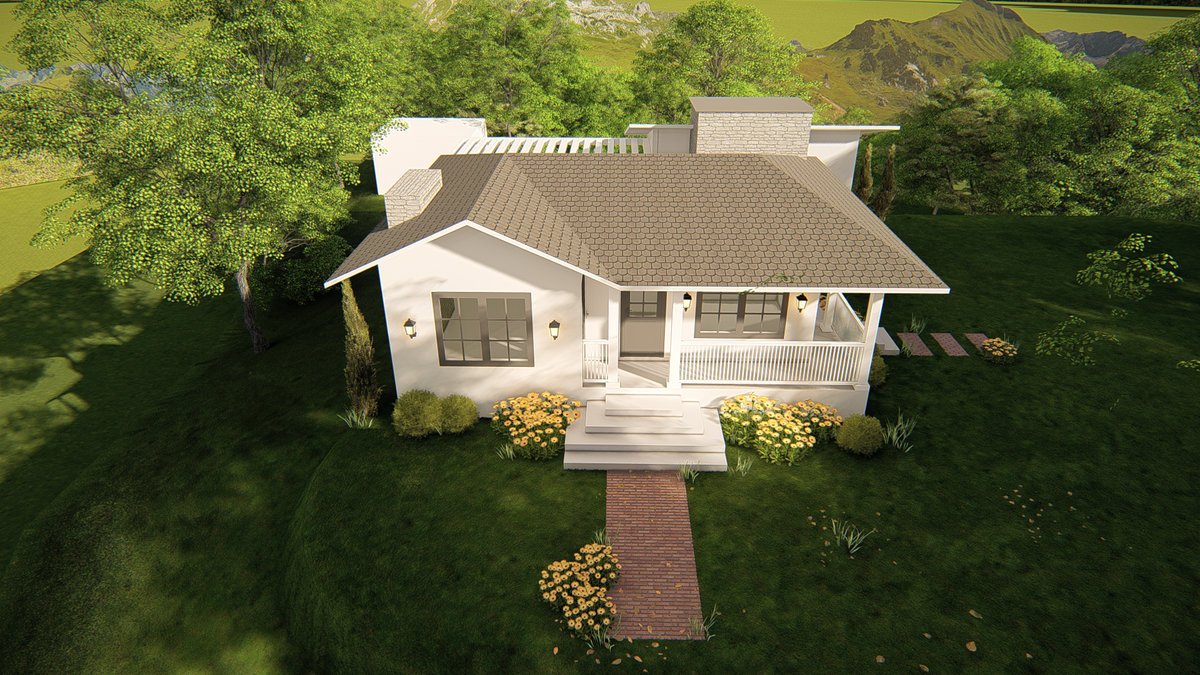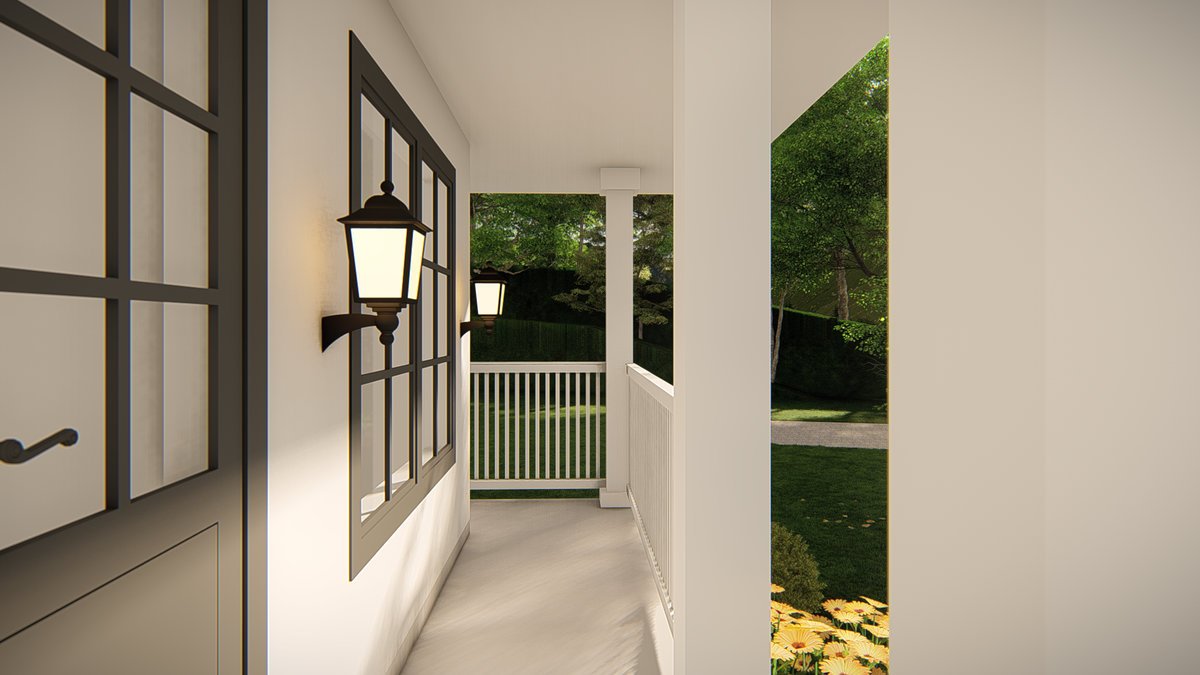 Inspirada no estilo americano, ela combina o charme das varandas frontais com colunas elegantes, janelas com caixilhos escuros e um telhado de duas águas que reforça sua estética acolhedora e atemporal.