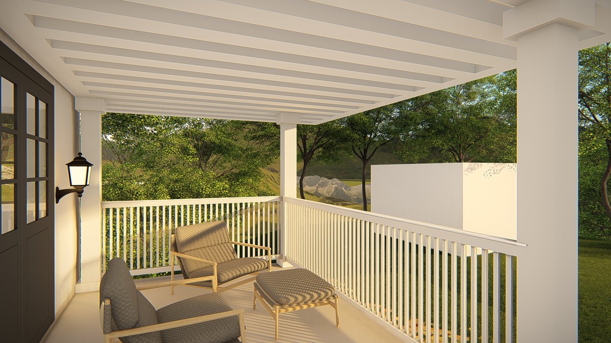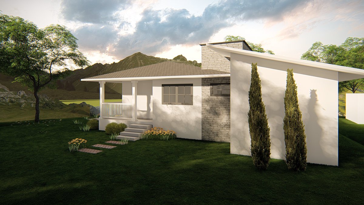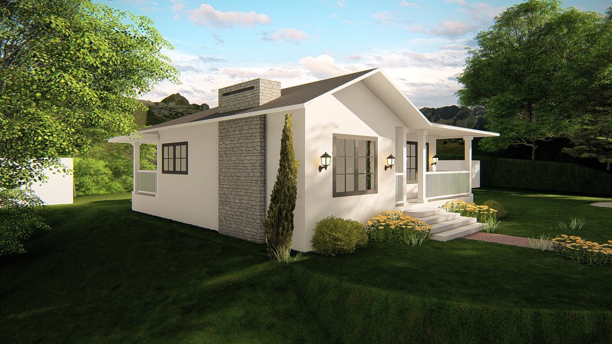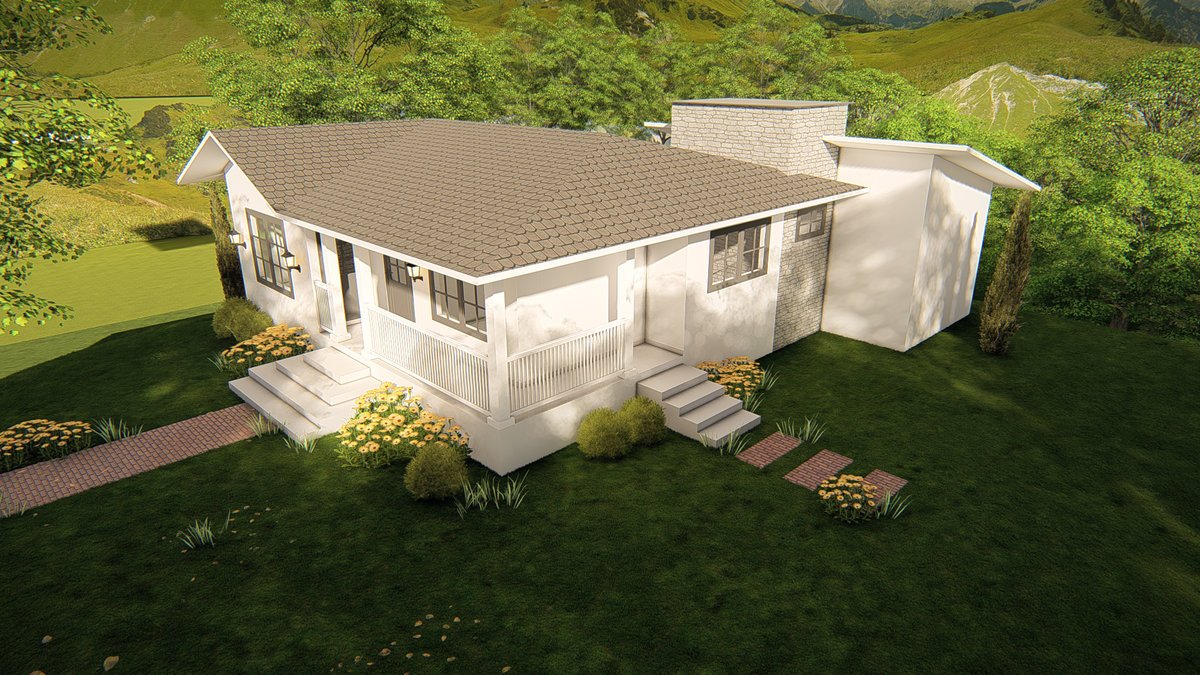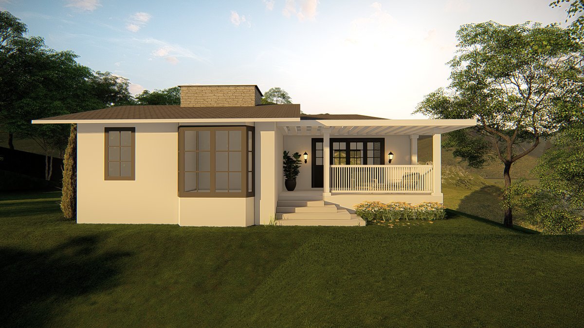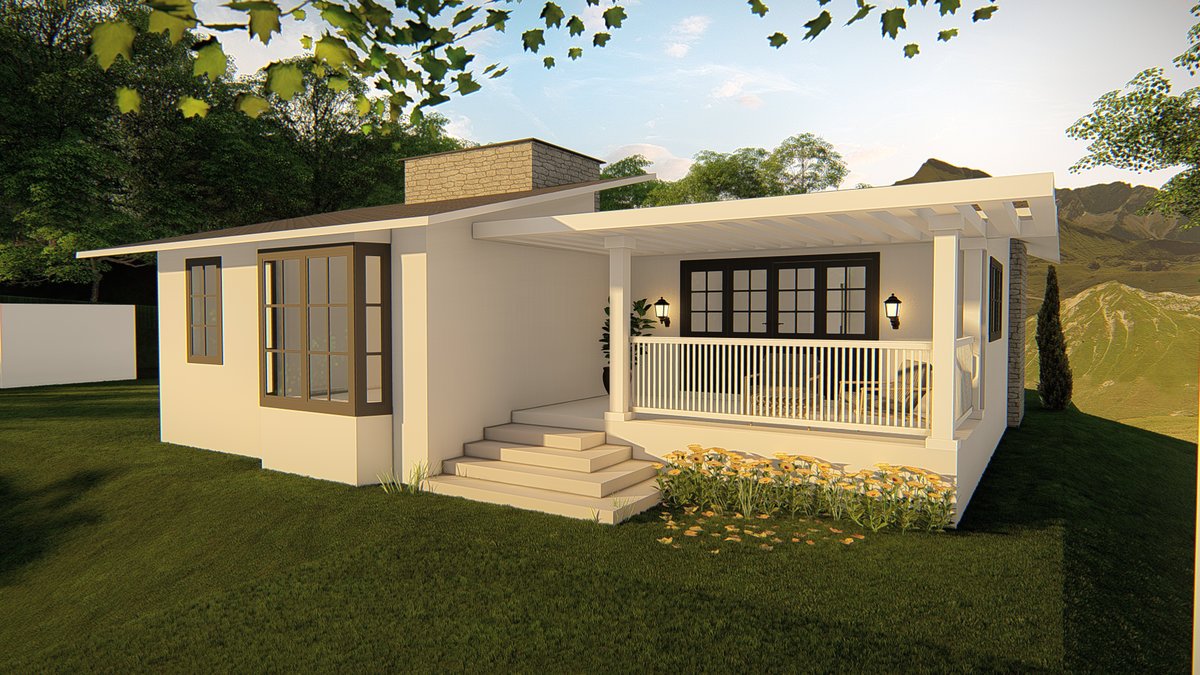Inspirada no estilo americano, ela combina o charme das varandas frontais com colunas elegantes, janelas com caixilhos escuros e um telhado de duas águas que reforça sua estética acolhedora e atemporal.